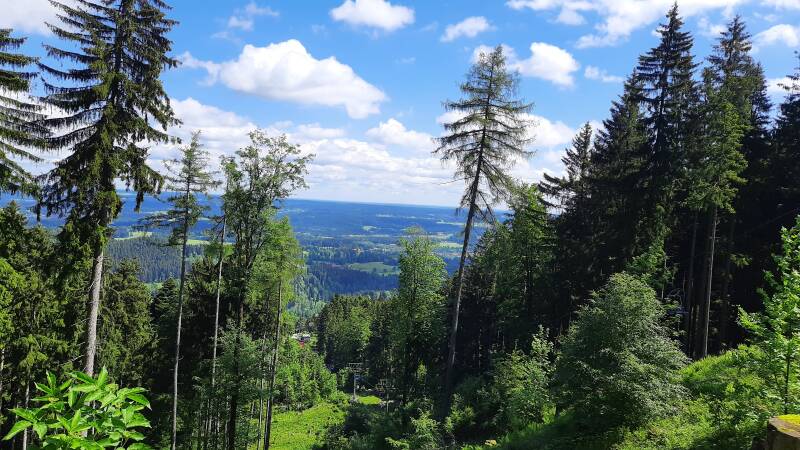 Durch den Bergwald zieht sich der Weg hinauf, was bei sonnigen Wetter sehr angenehm ist. Nach einer Weile erreichen wir die Mittelstation, ab hier kann man mit der Sommerrodelbahn Classic hinabdüsen. Das ist unser Ziel für den Rückweg. Wir wandern weiter und erreichen nach insgesamt einer guten Stunde das Blomberghaus.